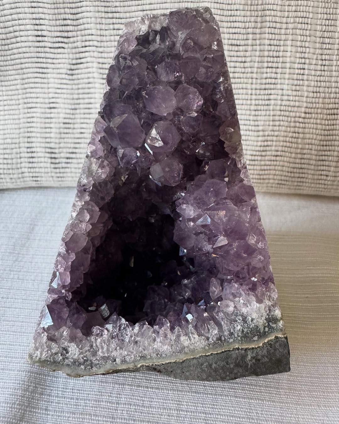 Натуральна друза аметиста з глибоким фіолетовим сяйвом. Цей камінь відомий своїми потужними енергетичними властивостями — він очищує простір, гармонізує енергію, заспокоює думки та сприяє духовному зростанню. Ідеально підходить для медитацій, практик, або як прикраса для дому з глибоким змістом.